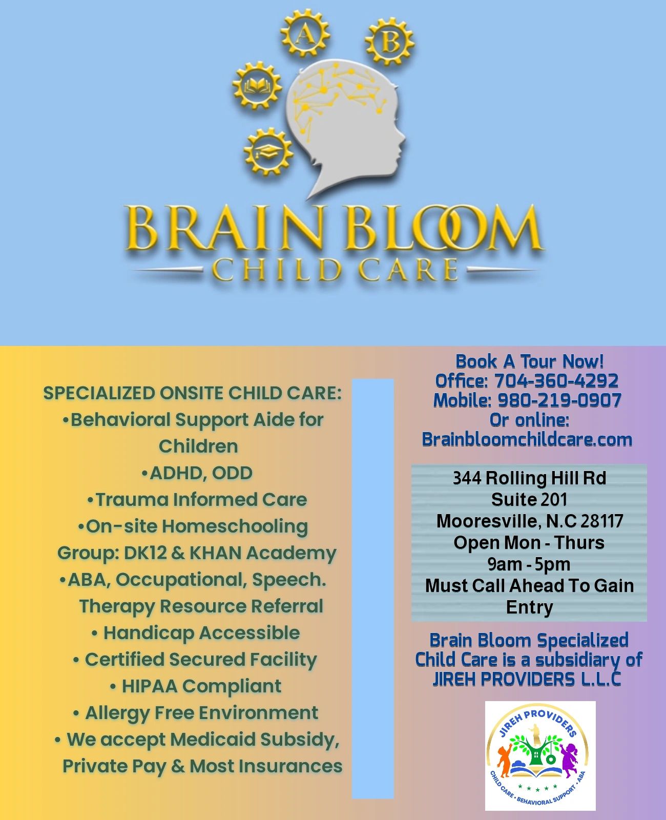 Welcome to Brain Bloom Child Care, where we provide exceptional child care services for children of all ages. Our dedicated team of professionals is committed to providing a safe and nurturing environment where children can learn, grow and thrive. We offer a range of programs to meet the needs of families, including full-time care, part-time care, and after-school programs. Our curriculum is designed to promote cognitive, physical, and social development in a fun and engaging way. Contact us today to schedule a tour and see firsthand why Brain Bloom Child Care is the best choice for your child's care.